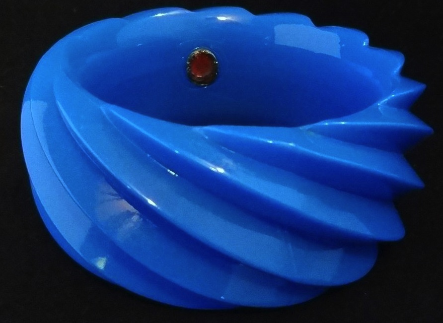 Lucite was a popular early form of plastic that is still used today. While transparent in its natural state, lucite can be dyed many colors, molded and imbedded, so comes in a wide and sometimes wild variety of colors and looks. It is found transparent to opaque. In vintage times, it was used to make everything from plastic toys to jewelry. Colorful versions of jewelry are often mistaken for catalin plastic which could also be made in many colors and textures.