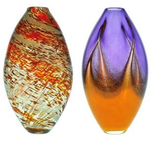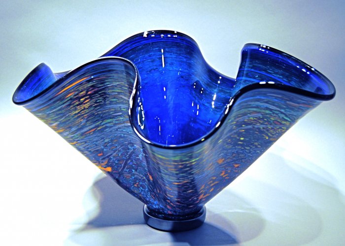 Blown glass is an ancient form of glass making that is still used in the fine arts. The molten glass is formed by literally blowing it throw a tube. The resulting glass item will often have a blown look and glass varying in thickness. It will not have a seem. It often has a pontil or rod mark, where the pipe was attached. It will appear as a little hole or bump, though it is sometimes smoothed over. Blown glass can have tiny bubbles or shifts, and colors that mix together. Some may be assembled from multiple parts into one piece.